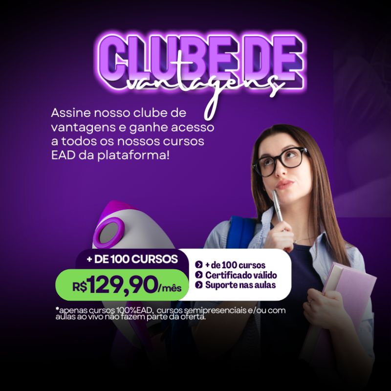 Assine o Clube de Vantagens e tenha acesso a mais de 100 cursos livres profissionalizantes 100% EAD. Uma assinatura mensal pensada para quem quer se qualificar, evoluir na carreira e aprender no seu ritmo, com certificado válido e suporte durante as aulas — tudo isso por um valor acessível.