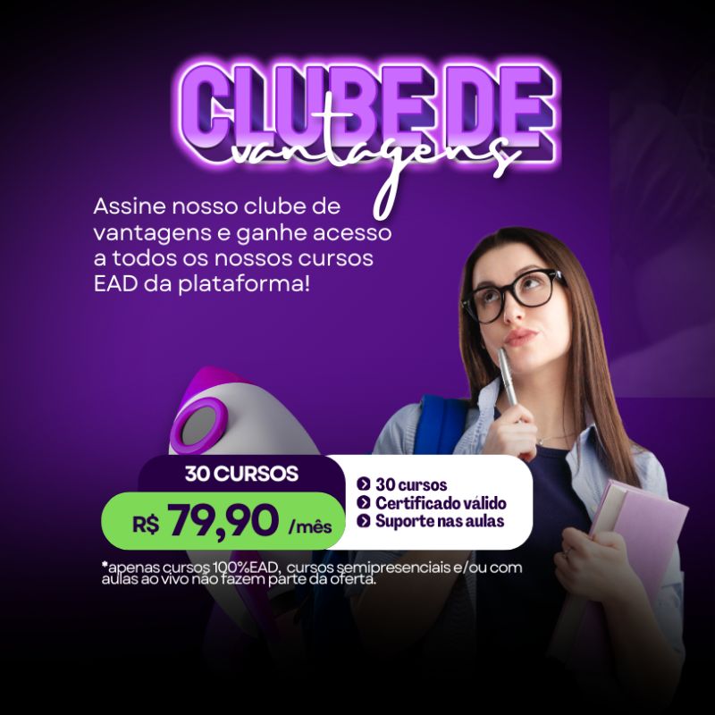 Assine o Clube de Vantagens e tenha acesso até 30 cursos livres profissionalizantes 100% EAD. Uma assinatura mensal pensada para quem quer se qualificar, evoluir na carreira e aprender no seu ritmo, com certificado válido e suporte durante as aulas — tudo isso por um valor acessível.